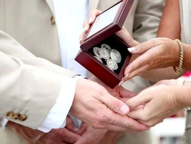 The gift of coins is given by the couple as a symbol of his obligation and desire to care and provide for the family. The bride’s acceptance symbolizes her mutual obligation to care for the family and home.