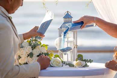 Similar to the water ceremony, the couple both pour different colored sand into a larger glass. This can be done in a way that creates a unique design by the two different colored sands, symbolizing the two individual lives now blended together and working as one.