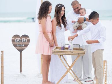 The unity ceremony is a perfect time to involve your children in the coming together of families. Have the little ones lend a hand to a sand or salt combining ceremony.