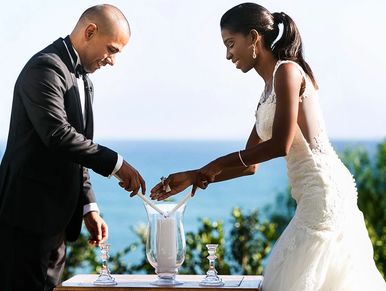 One of the most common ceremonies. The couple each take a lit candle and simultaneously light a third larger “unity candle.” They may blow out their individual lights, or leave them lit, symbolizing that they have not lost their individuality in their unity.