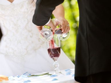 In the Unity Wine ceremony, the couple each take a carafe of wine and pour the wine into a single glass. They both drink the mixed win to symbolize their willingness to share in both the joys and the disappointments of life.